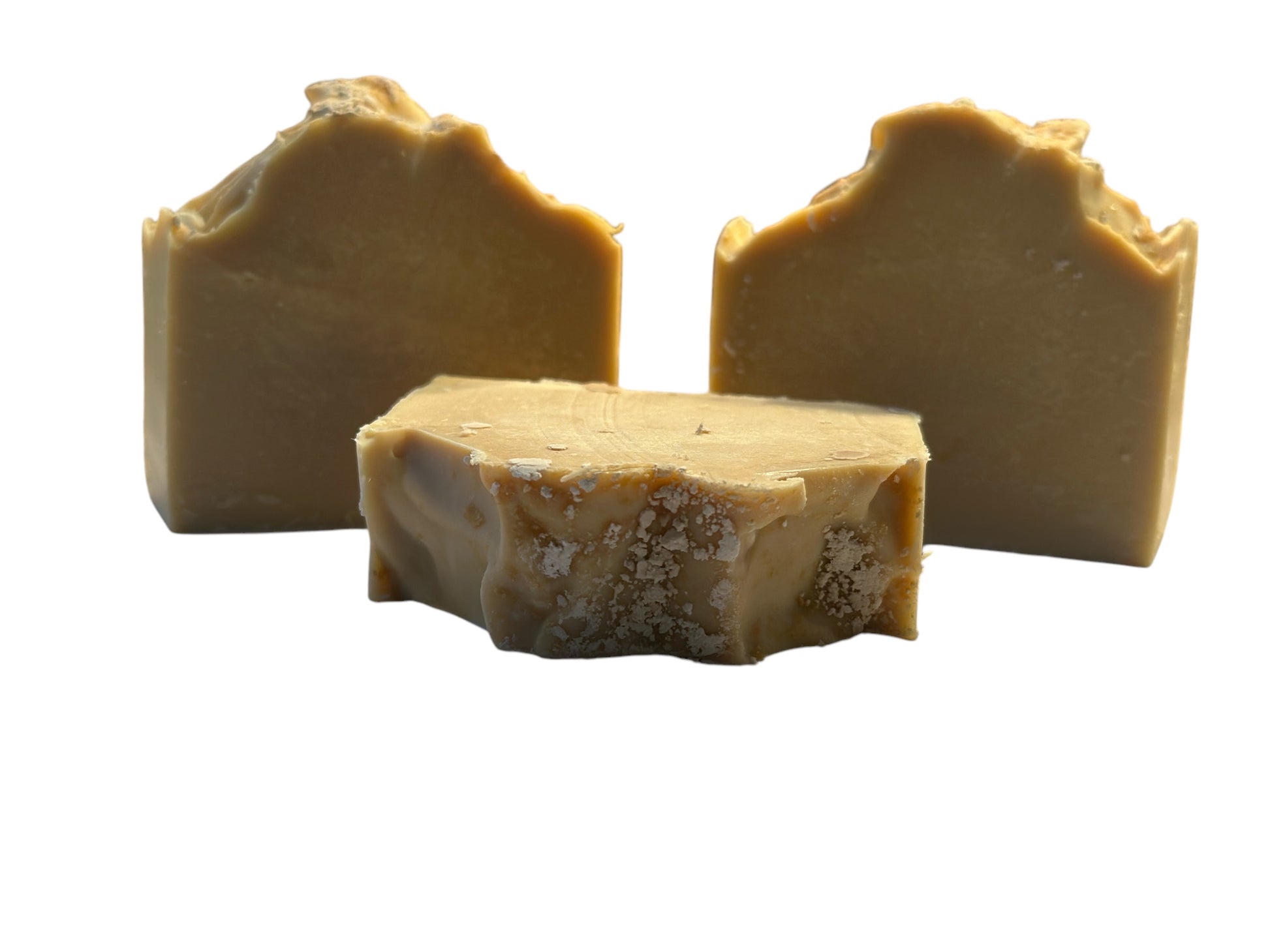 Olive Oil, Coconut Oil, Shea Butter, Cocoa Butter, Castor Oil, Distilled Water, Sodium Hydroxide (used in the soapmaking process), Ground Oats, Raw Honey, Kaolin Clay